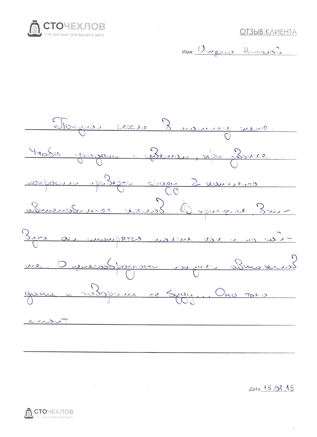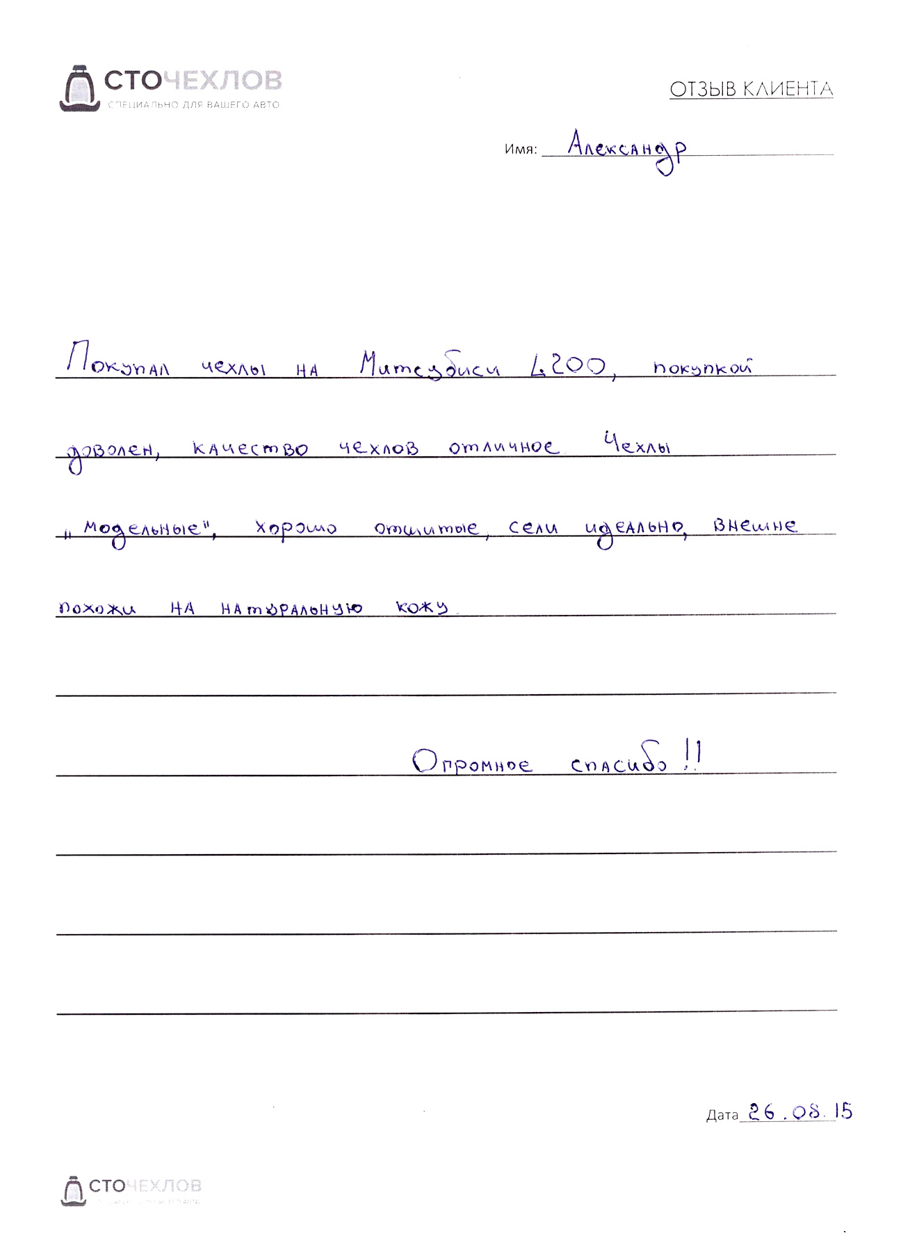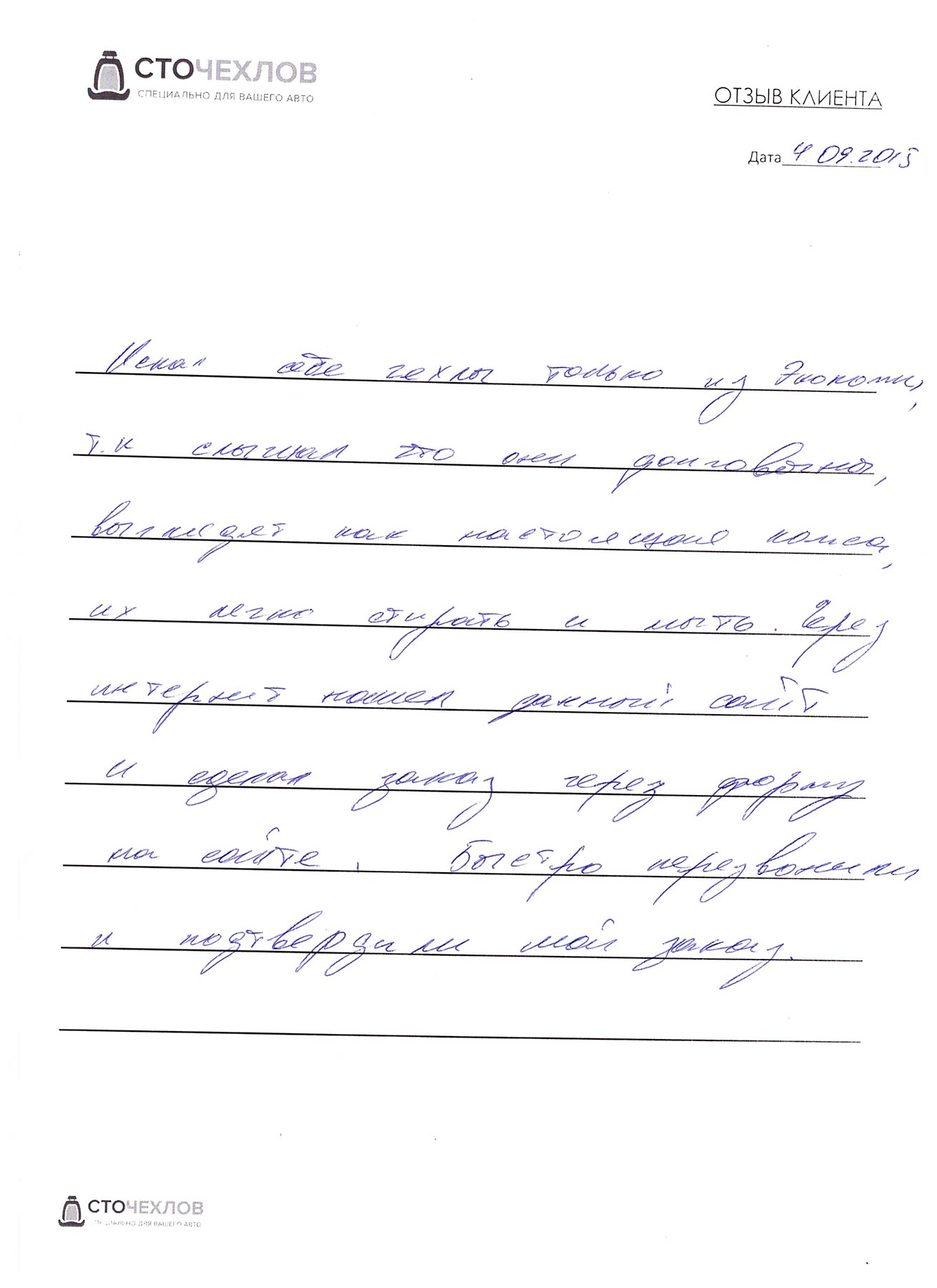 Хочу оставить отзыв о работе магазина авточехлов. После заказа, привезли в течение дня чехлы, рассказали как установить их на авто. Безумно приятно работать с людьми ценящих мое и свое время. Спасибо!
